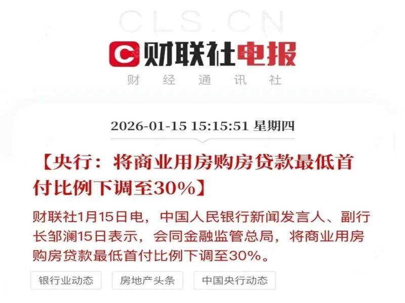 央行宣布!商业用房购房贷款最低首付比例下调至30%