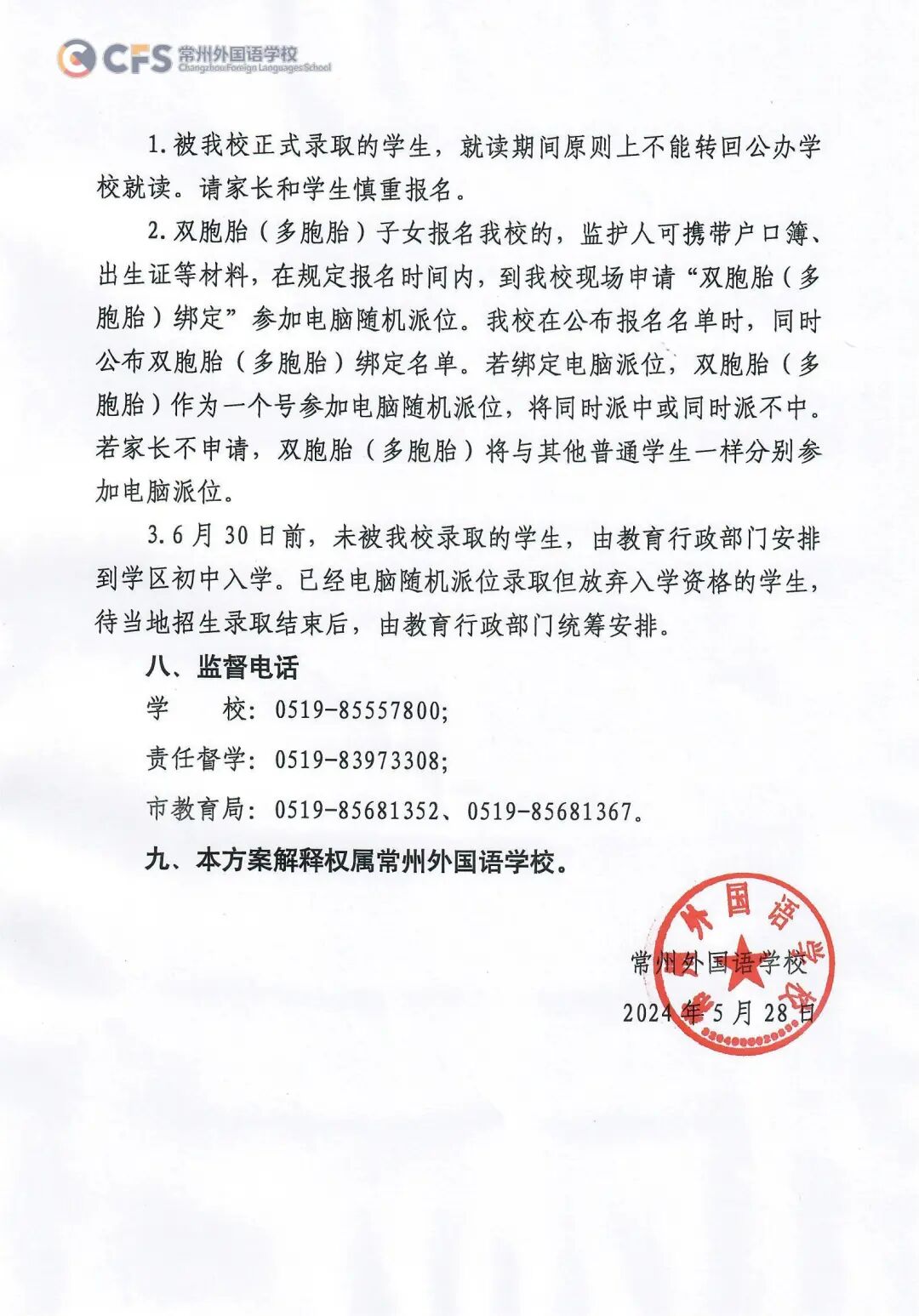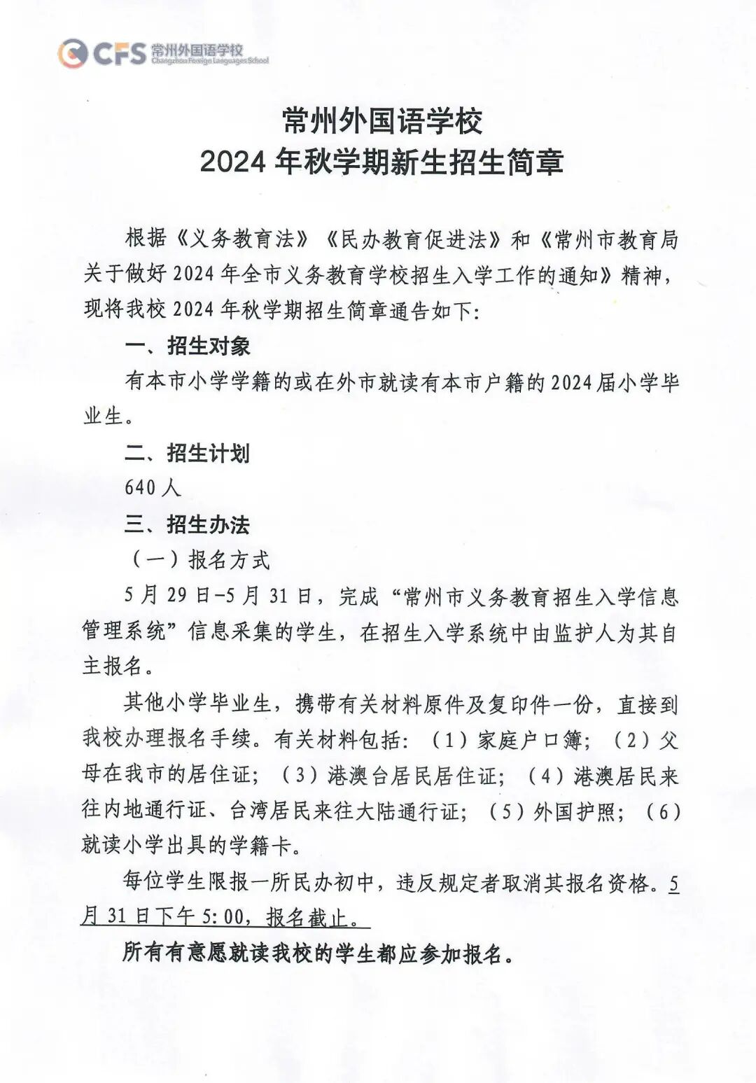 根据《常州市教育局关于做好2024年全市义务教育学校招生入学工作的通知》精神,现将我校2024年秋学期招生入学事项通告如下: