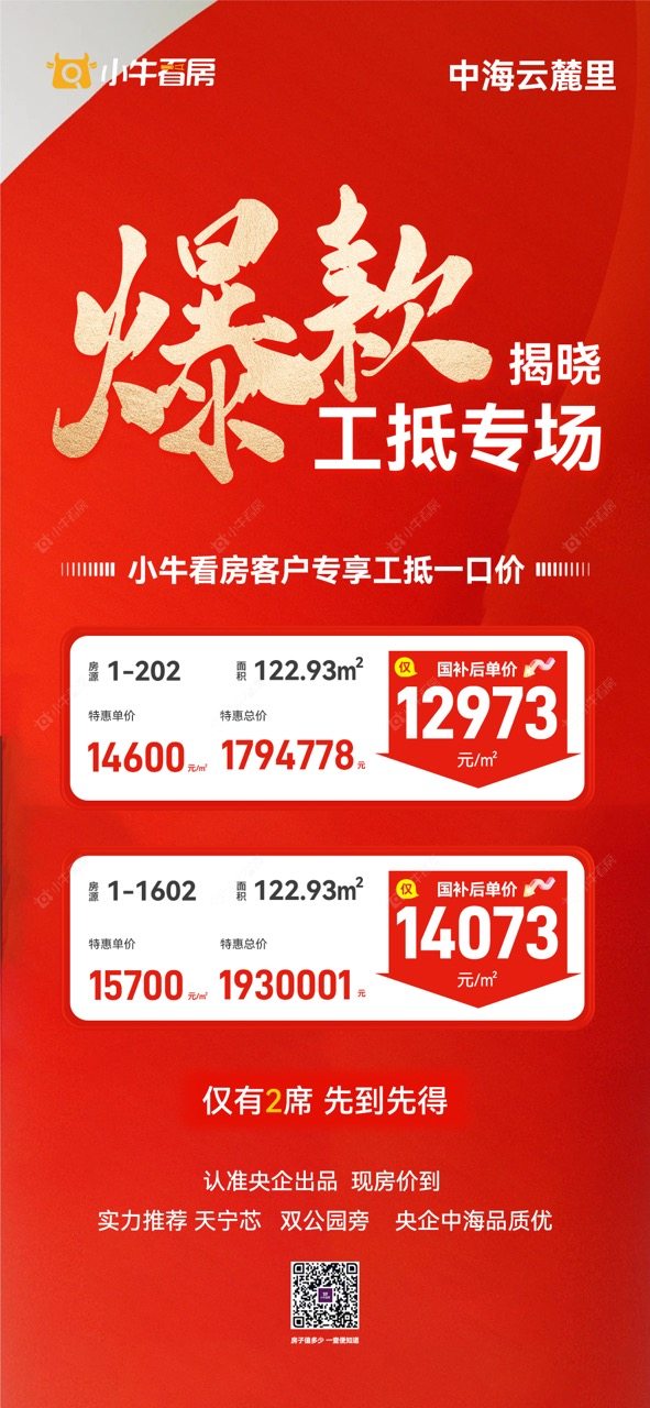 项目优惠认准央企出品 工抵特惠 仅2席 天宁芯 双公园旁 品质精装现房 小牛看房客户享工抵一口价房源 买中海云麓里 享优惠 找小牛看房