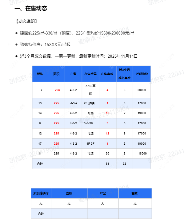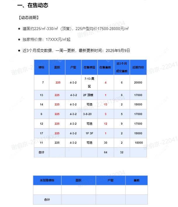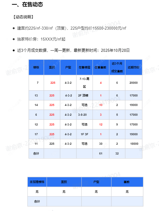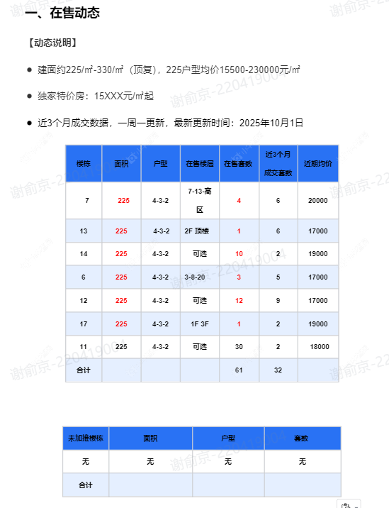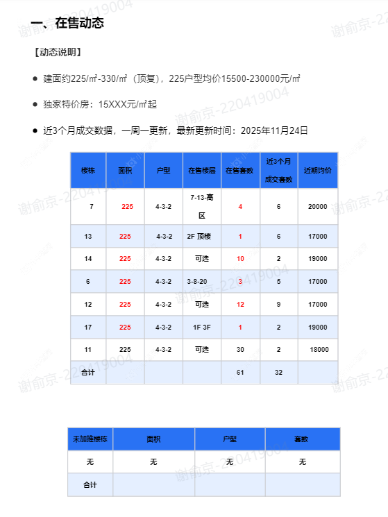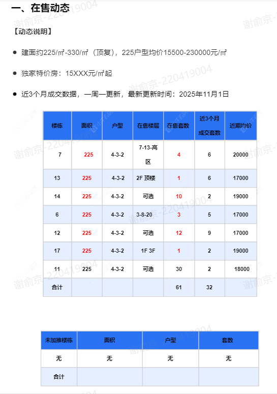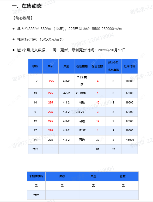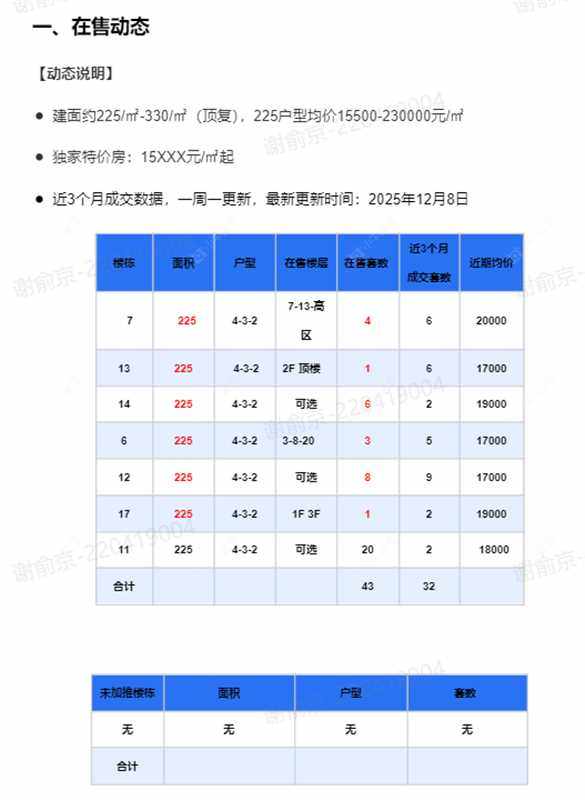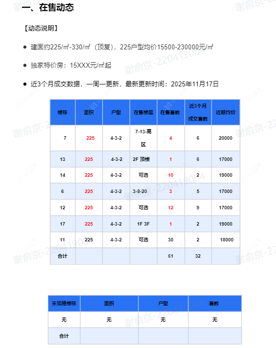 在售动态●建面约225/㎡-330/㎡(顶复),225户型均价15500-230000元/㎡ ●独家特价房:15XXX元/㎡起