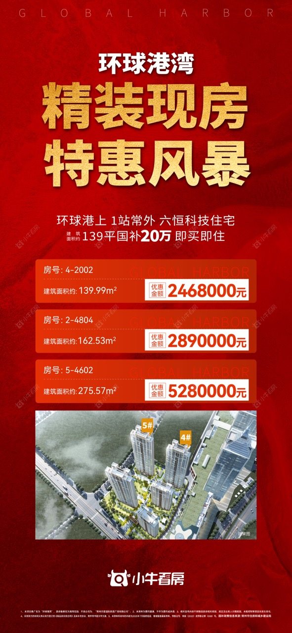 项目优惠环球精装现房 六恒科技住宅139平国补20万 即买即住小牛看房客户享一口价特惠买环球港湾,享优惠,找小牛看房