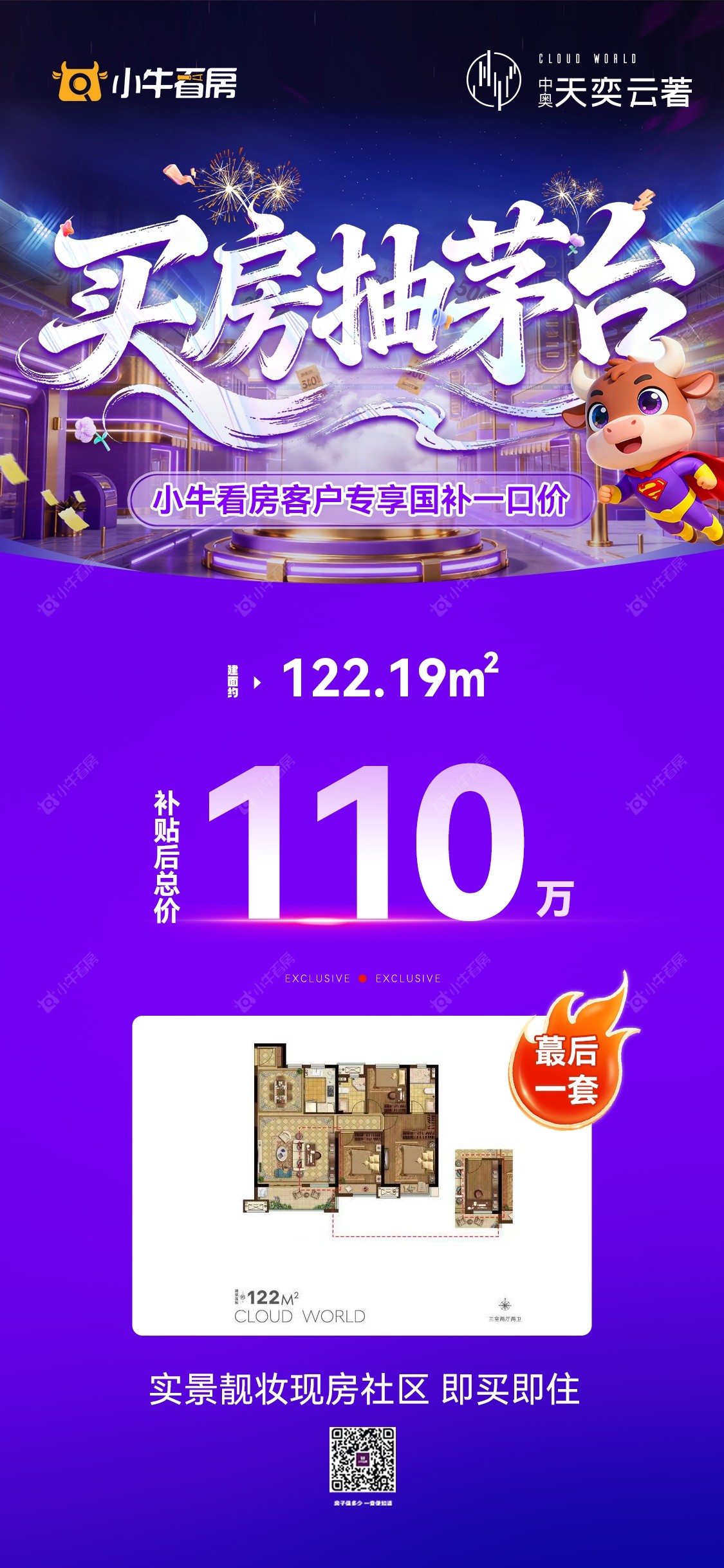 项目优惠小牛看房联手 中奥清盘大作战 实景靓妆现房社区 即买即住 小牛看房专享精妆特惠总价76万起 买天奕云著 享优惠 找小牛看房