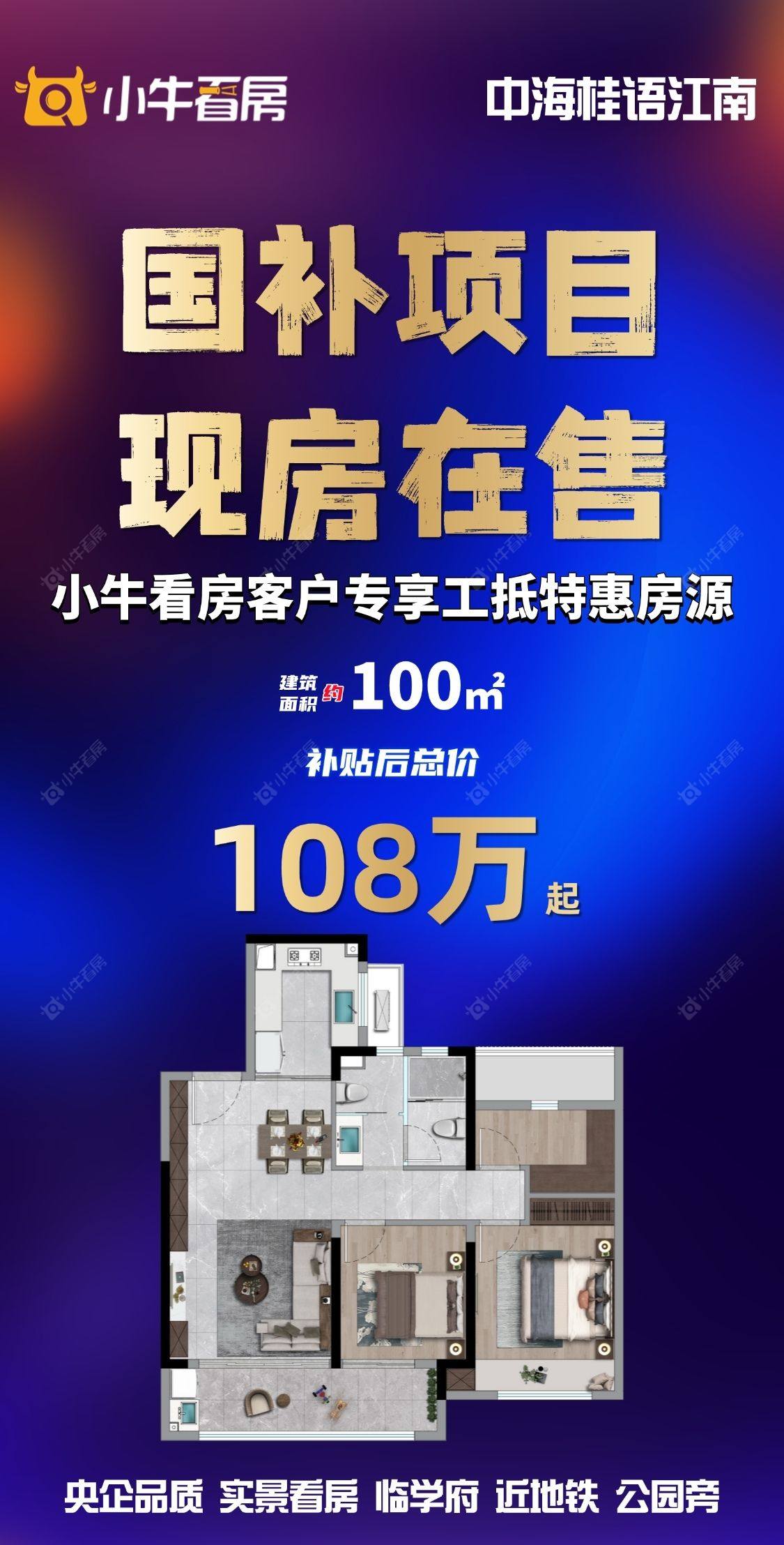 项目优惠地铁口!学府旁!公园边! > 央企品质现房,国补可用 小牛看房客户享国补后 108万起 买桂语江南,享优惠,找小牛看房