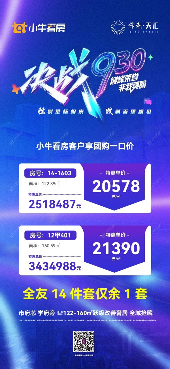 项目优惠14# 122平国补优质房源余量告急市府芯 学府旁 央企+双商加持小牛看房客户享抄底19966元/m²起买保利天汇,享优惠,找小牛看房
