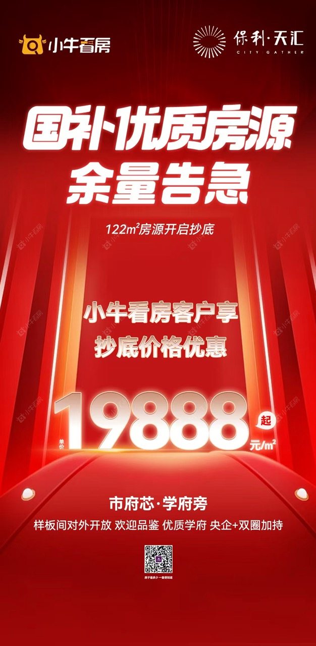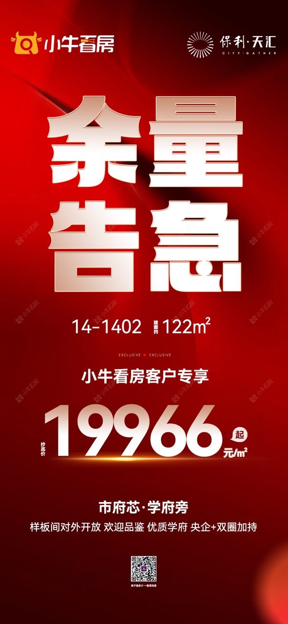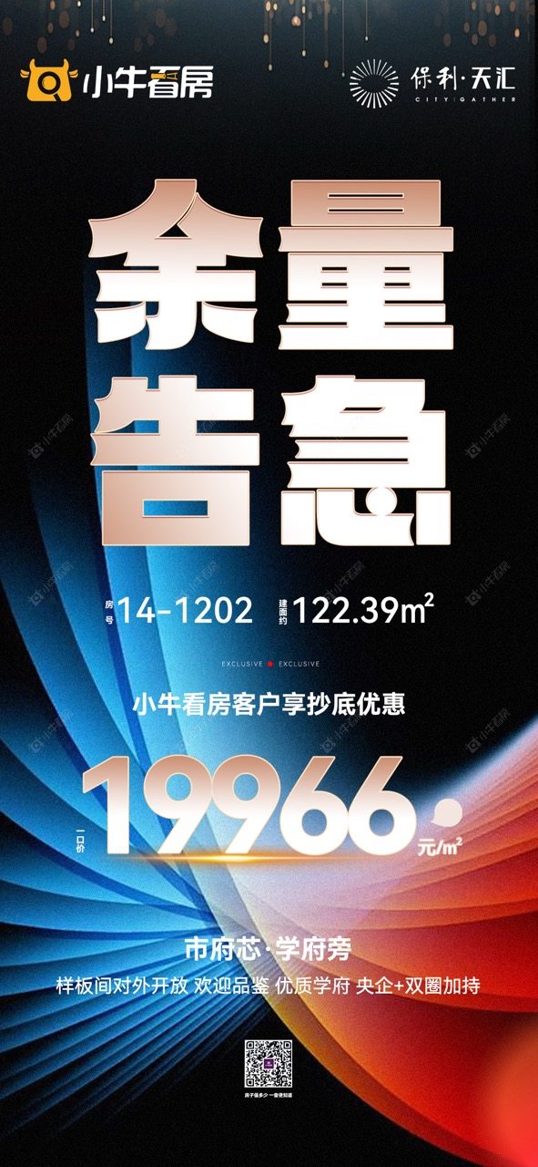 项目优惠14# 122平国补优质房源余量告急 市府芯 学府旁 央企+双商加持 小牛看房客户享抄底19888元/m²起 买保利天汇,享优惠,找小牛看房