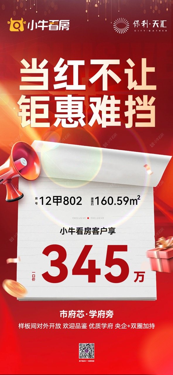 项目优惠市府芯 当红不让 钜惠难挡优质学府 央企+双商加持小牛看房客户享优惠345万买保利天汇,享优惠,找小牛看房