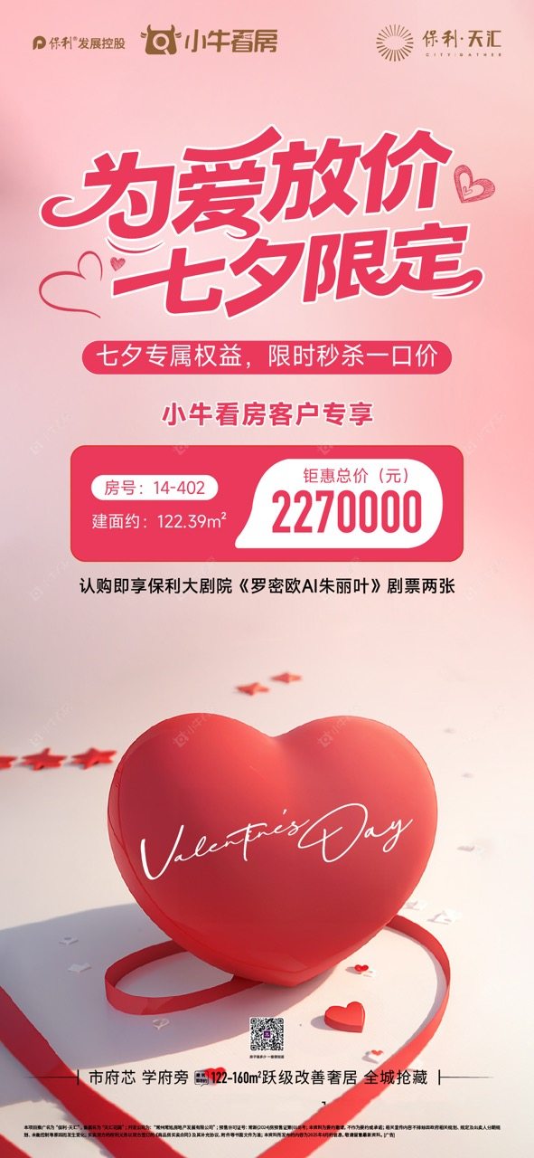 项目优惠为爱放价 七夕限定 低区房源告急 市府芯 学府旁 央企+双商加持 小牛看房客户享限时秒杀一口价 买保利天汇,享优惠,找小牛看房