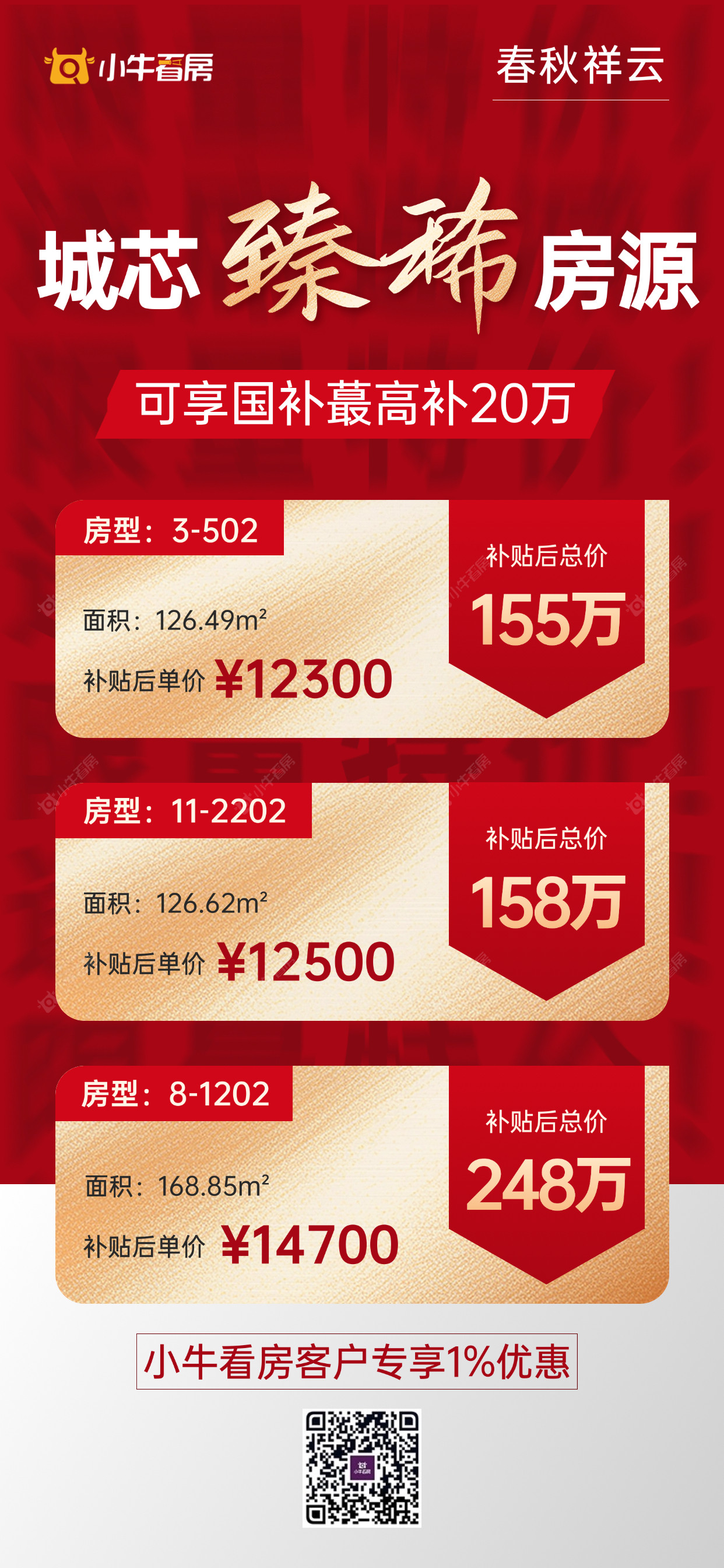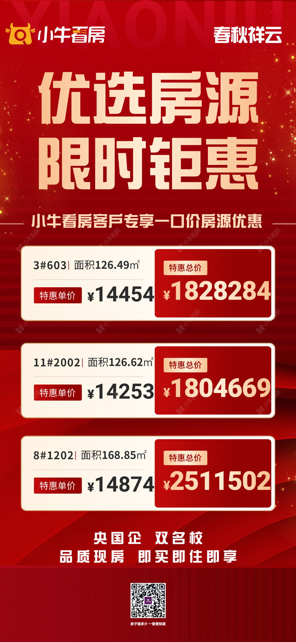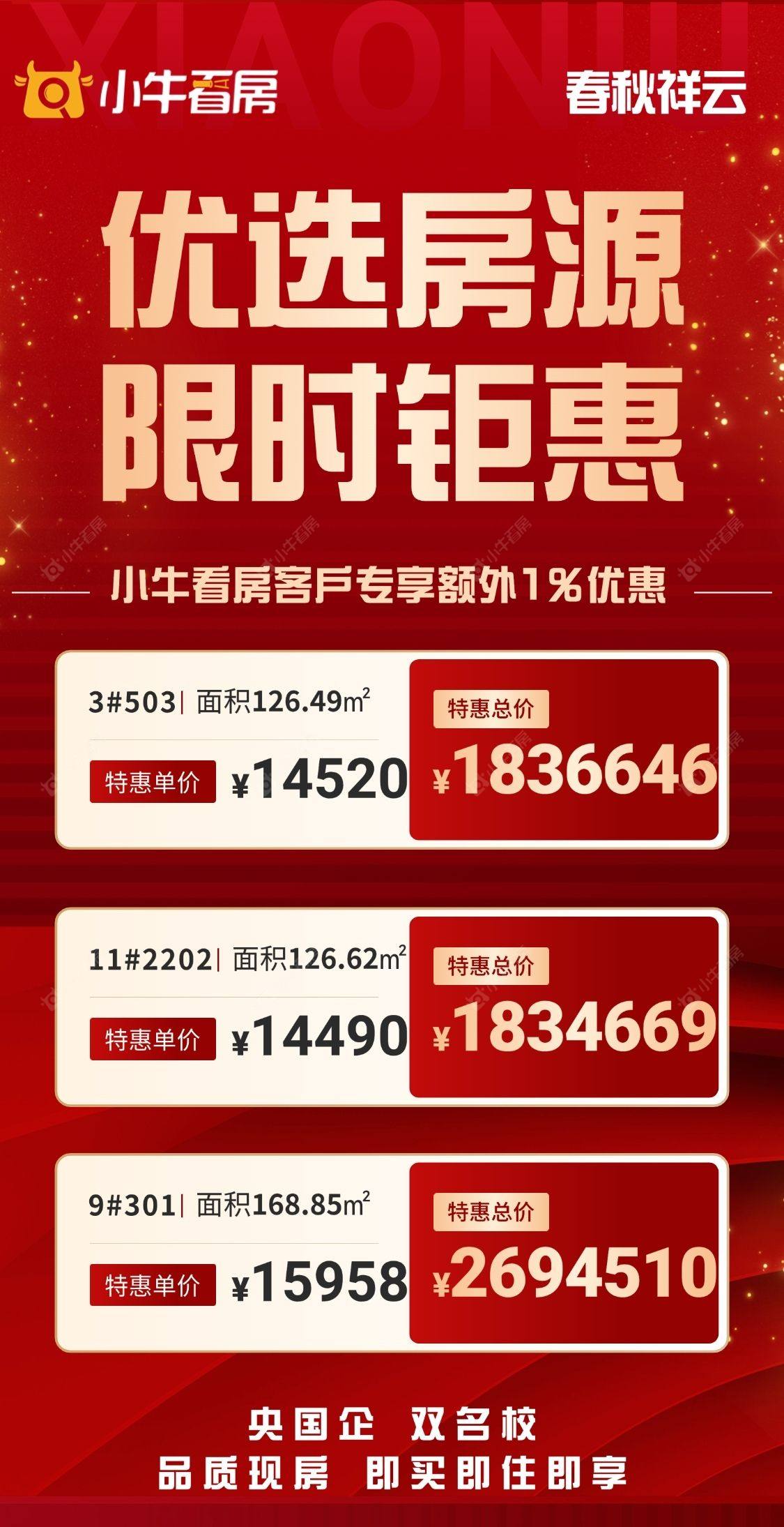 项目优惠国央企品质房 双学区加持 精妆现房 即买即住即享 小牛看房客户专享额外1%优惠 买春秋祥云 享专属福利 认准小牛看房