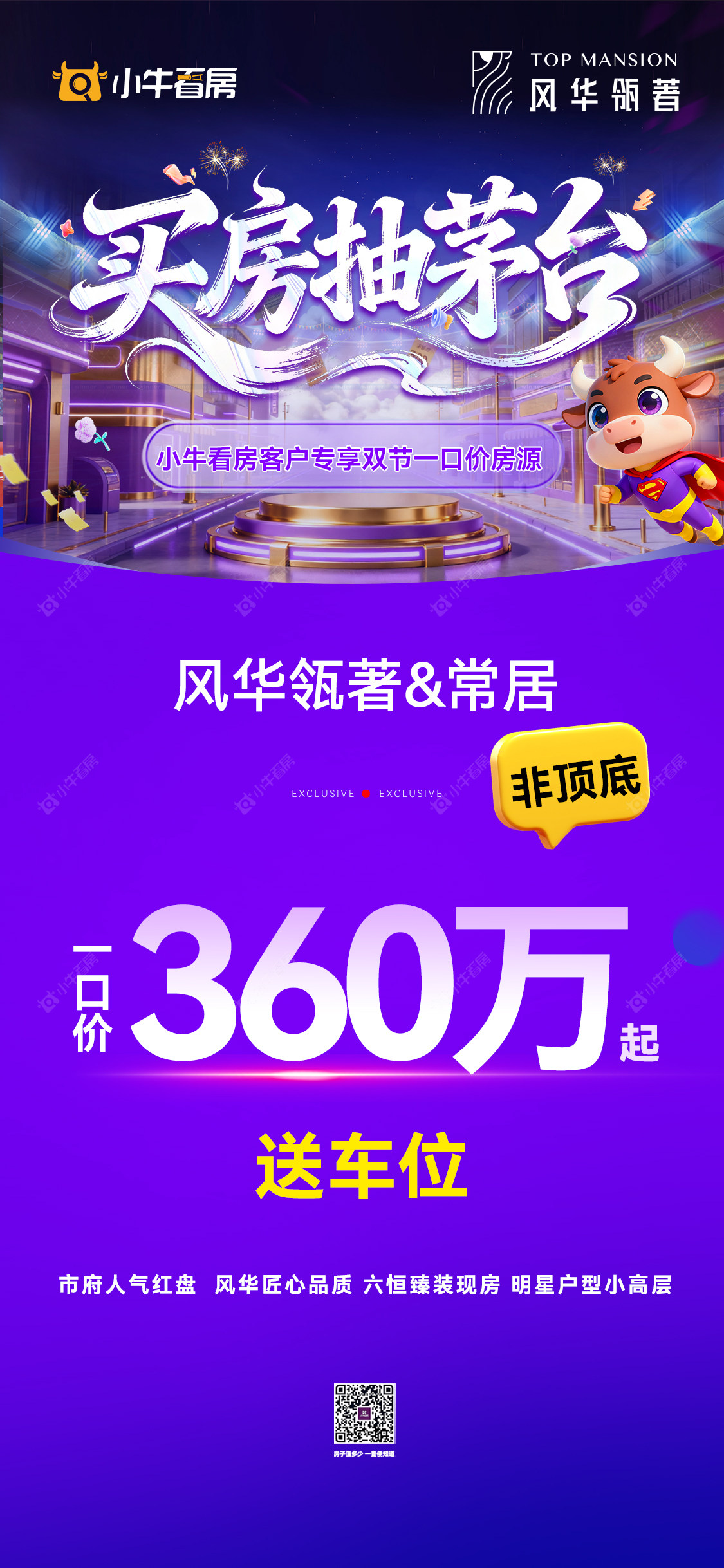 项目优惠清盘优惠 360万起送车位非顶楼市府芯 六恒现房 全天采光小牛看房客户专享一口价房源买风华瓴著,享优惠,找小牛看房