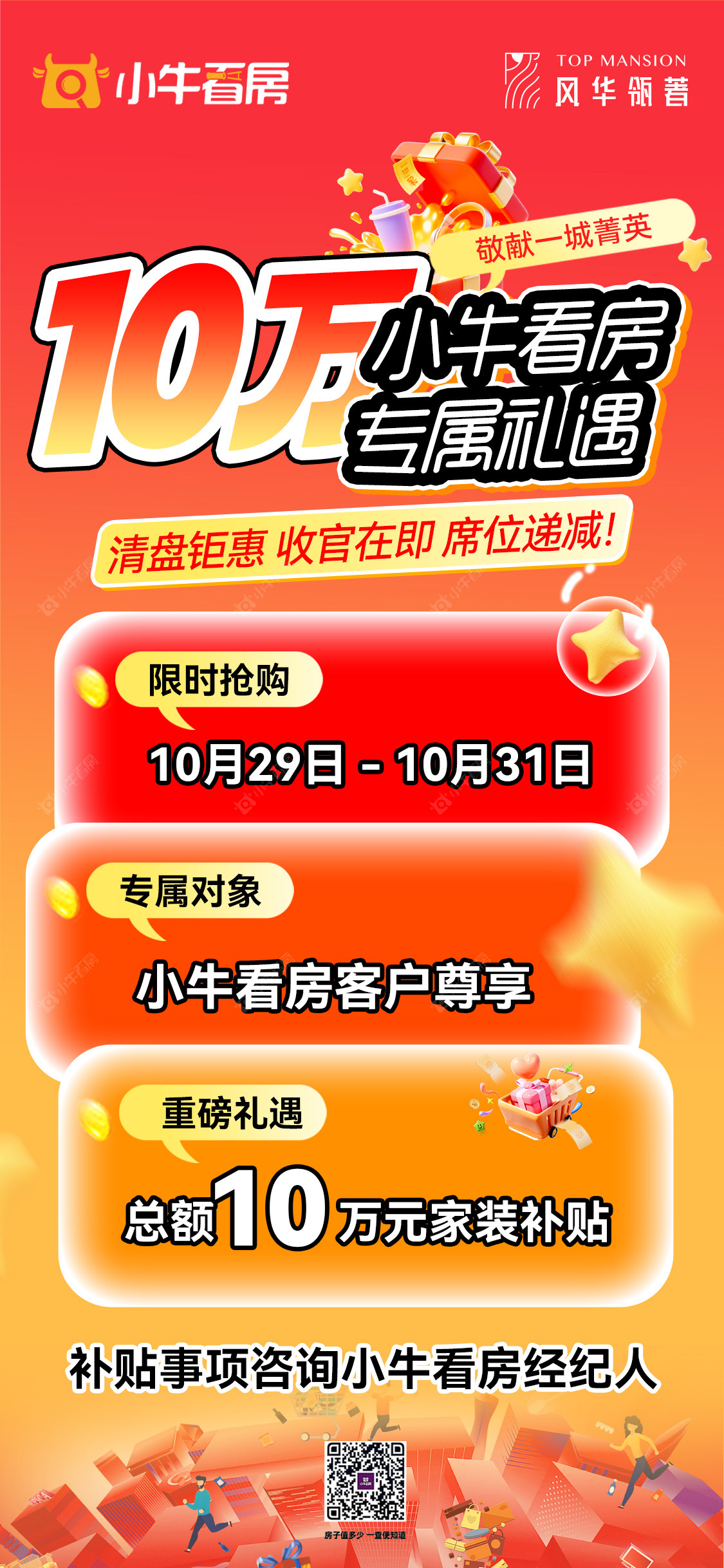 项目优惠王牌项目 · 清盘底价 · 收官在即,席位递减10万小牛看房专属礼遇,不限面积与楼层 10.29-10.31 谨限3天 余席有限,手慢无买风华瓴著,找小牛看房,享优惠