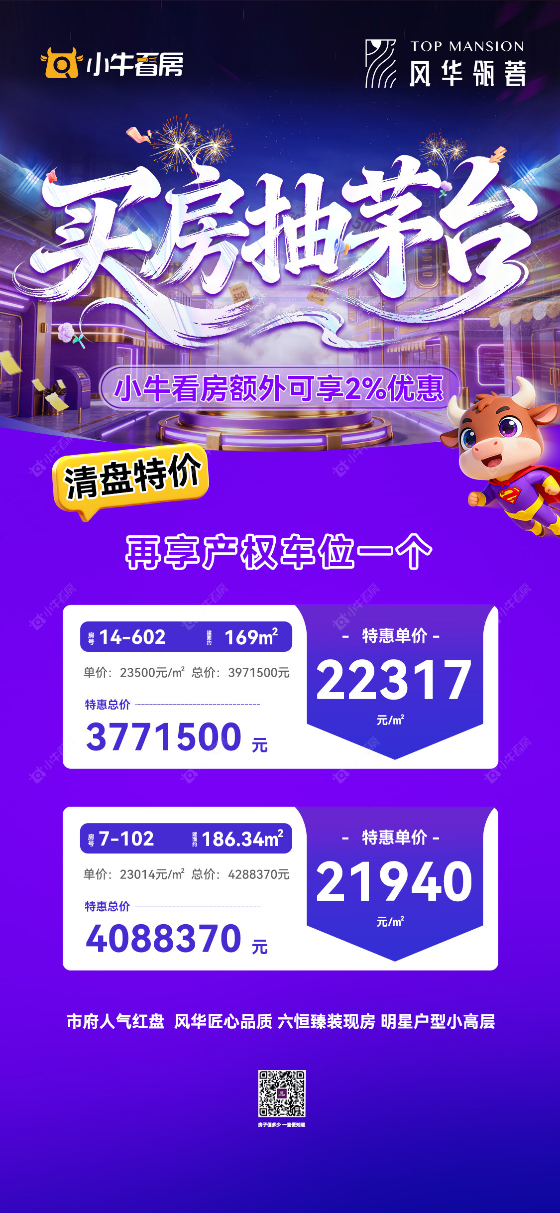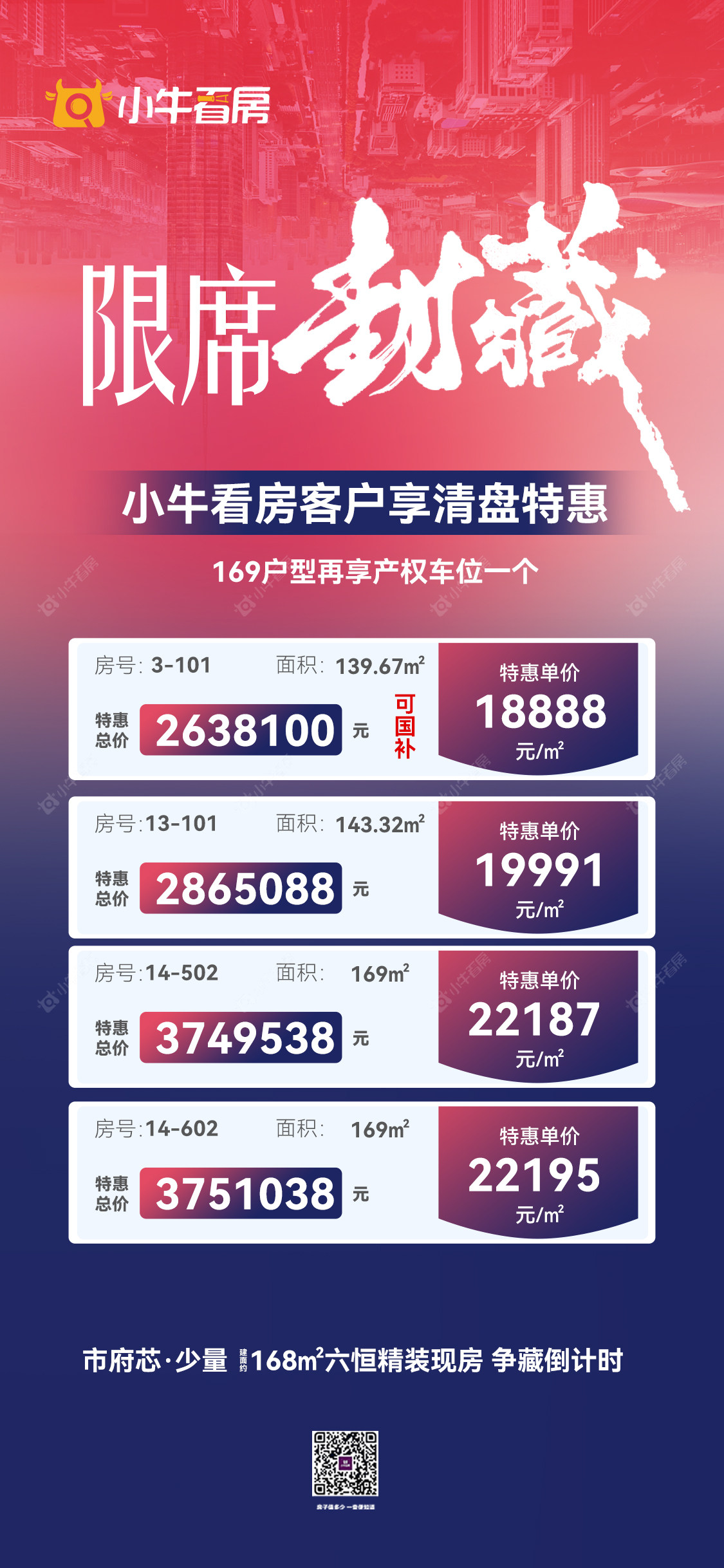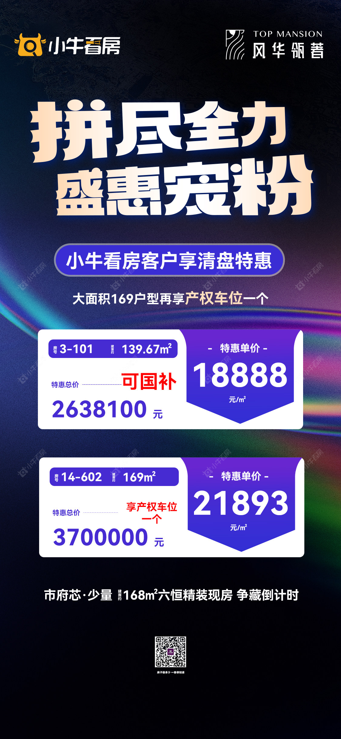 项目优惠拼尽全力 盛惠宠粉 139平可国补大面积169 户型在享产权车位一个市府芯 六恒系统现房 采光很好小牛看房客户专享清盘特惠买风华瓴著,享优惠,找小牛看房