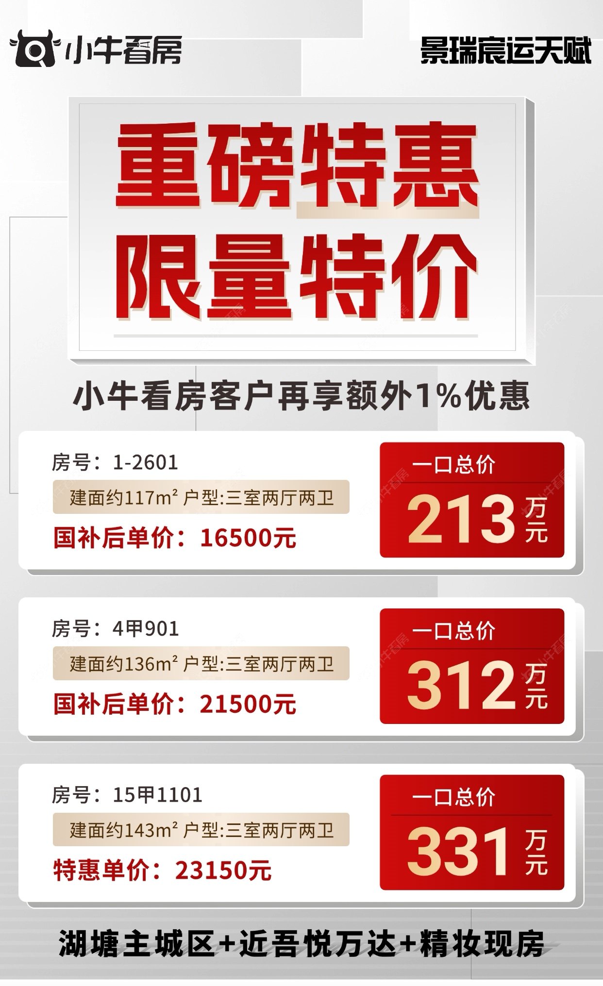 项目优惠湖塘主城区 精装奢宅117-143m²品质三房 出门就到公园 高层现房/洋房准现房 小牛看房客户专享特惠一口价房源 买景瑞新房 享优惠 找小牛看房