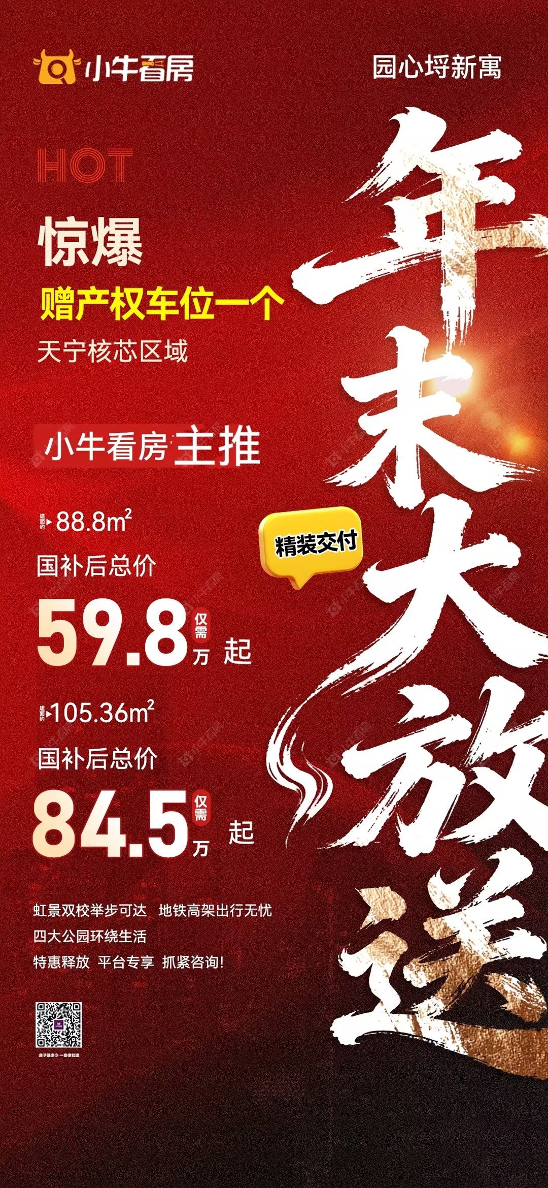 项目优惠🔥天宁核芯区年末捡漏!园心圩新富年末大放送! 88.8㎡精妆房国补后仅59.8万起,还送产权车位! 虹景双校+地铁高架+四大公园环绕,刚需上车闭眼冲!🚗💨 买新房 享优惠 找小牛看房