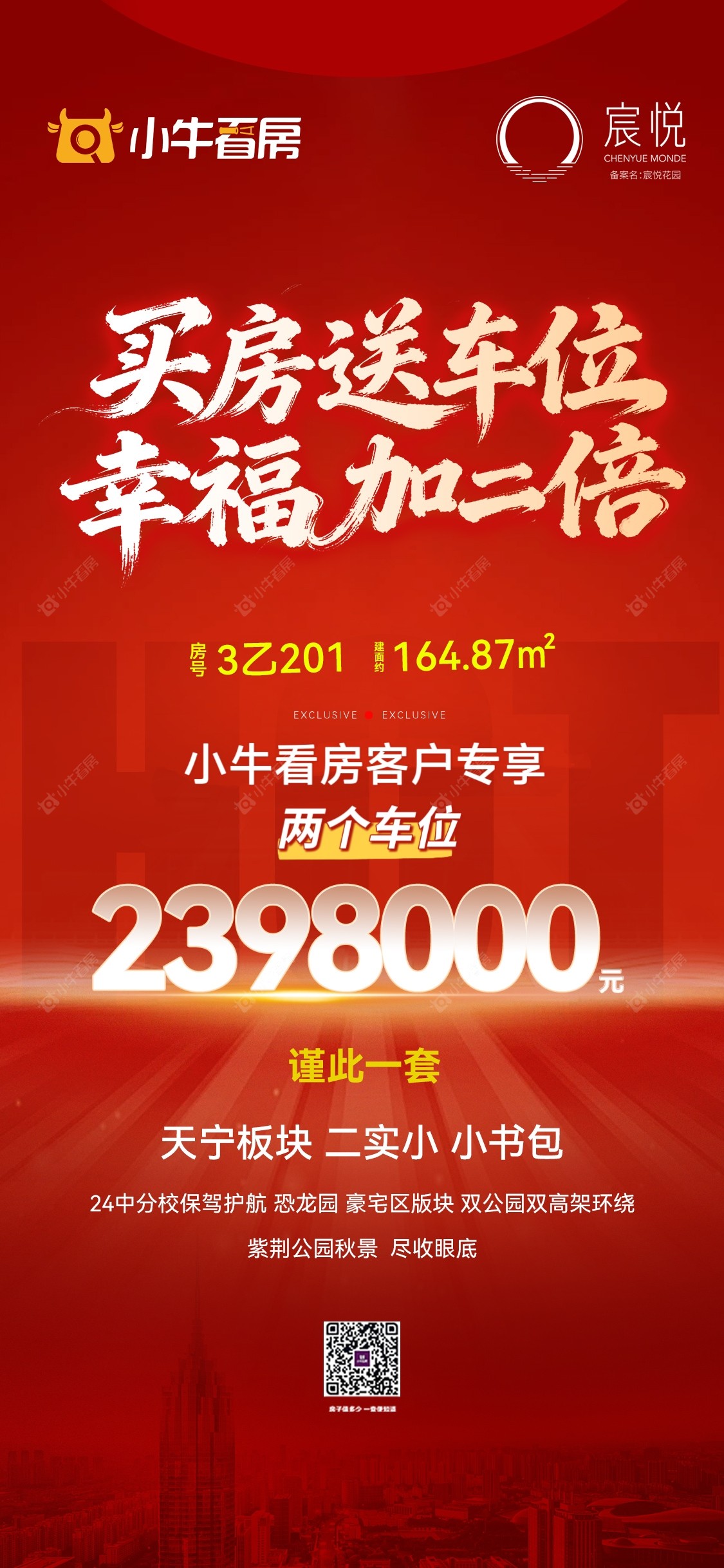 项目优惠买房送车位 幸福加双倍 谨此一套 二实小书包 约165户型 好楼层 小牛看房专享买房送两个车位 买阳光城 享优惠 找小牛看房