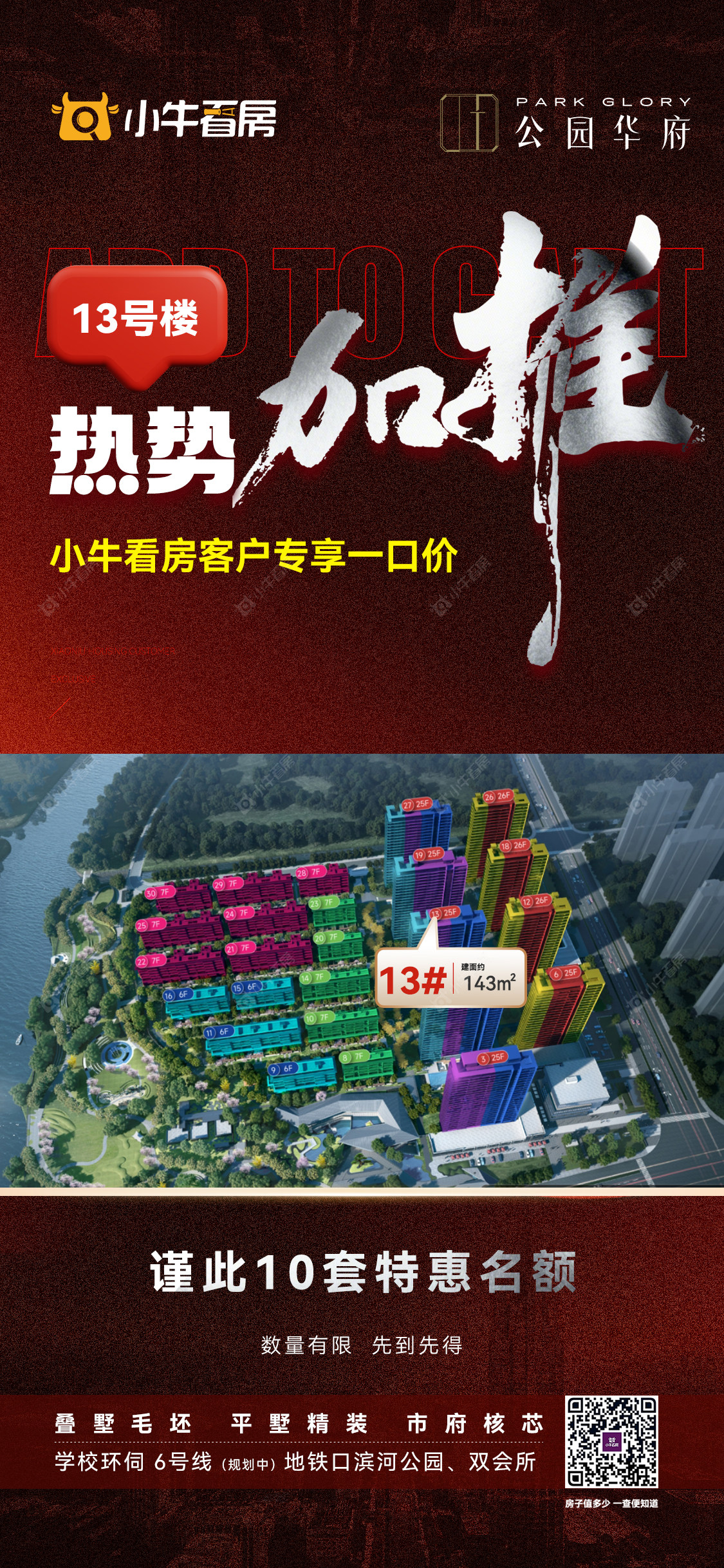项目优惠13号楼热势加推 143m²爆款户型 谨此10套特惠名额 学府旁·地铁口·滨河公园·双会所 小牛看房客户享特惠一口价 买公园华府,享优惠,找小牛看房