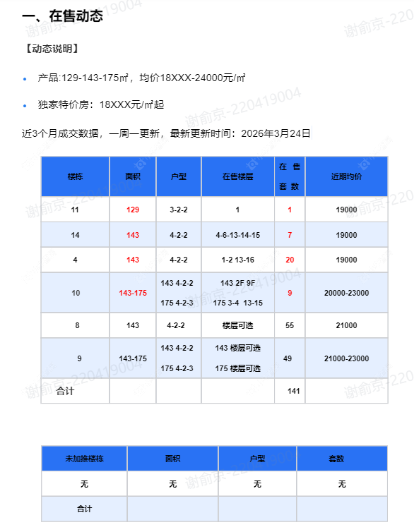 在售动态●产品:129-143-175㎡,均价18XXX-24000元/㎡ ●独家特价房:18XXX元/㎡起