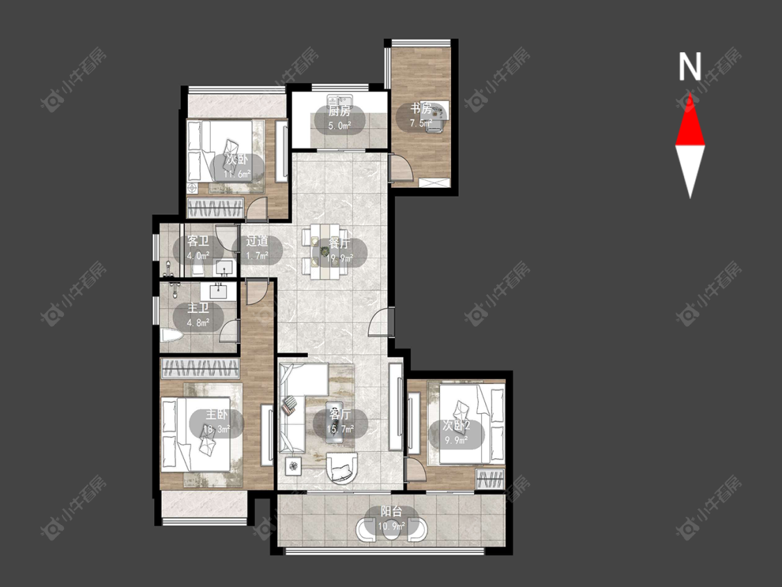 3室2厅2卫 | 115.57㎡ | 南、西、北
