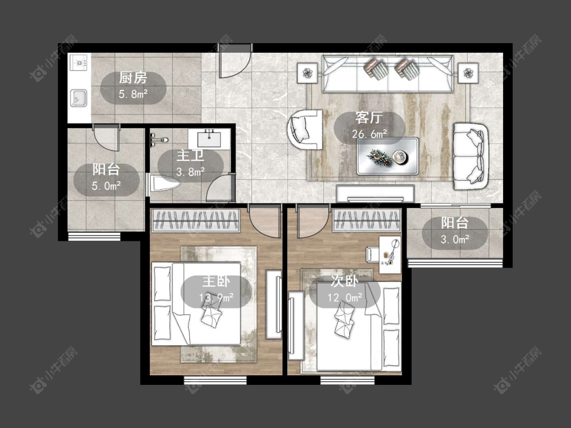 2室1厅1卫 | 90㎡ | 南