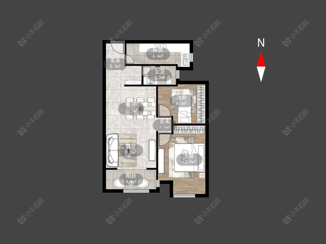 2室2厅1卫 | 91.4㎡ | 南