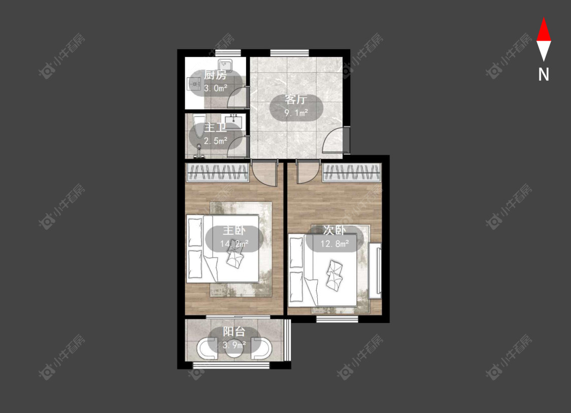 2室1厅1卫 | 60.48㎡ | 东、南、北